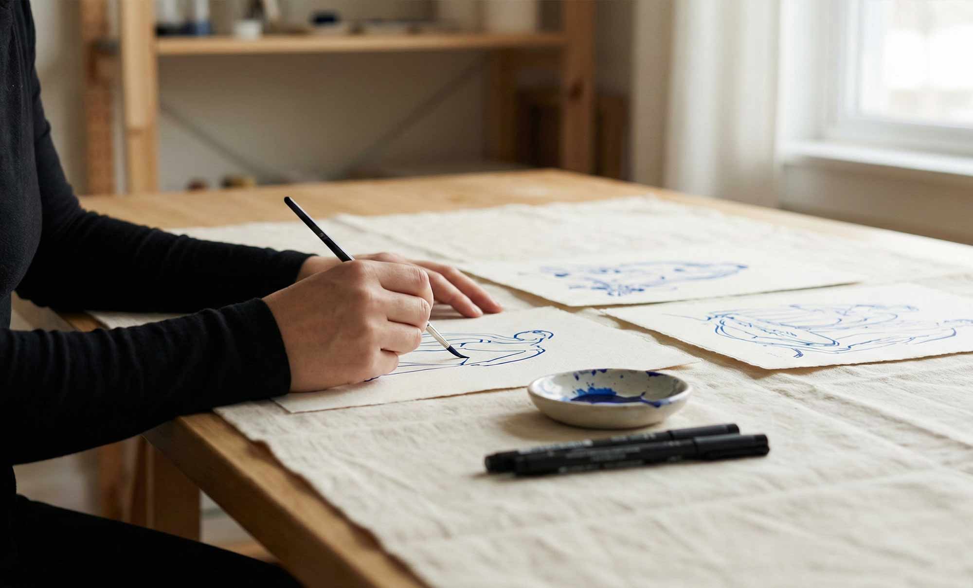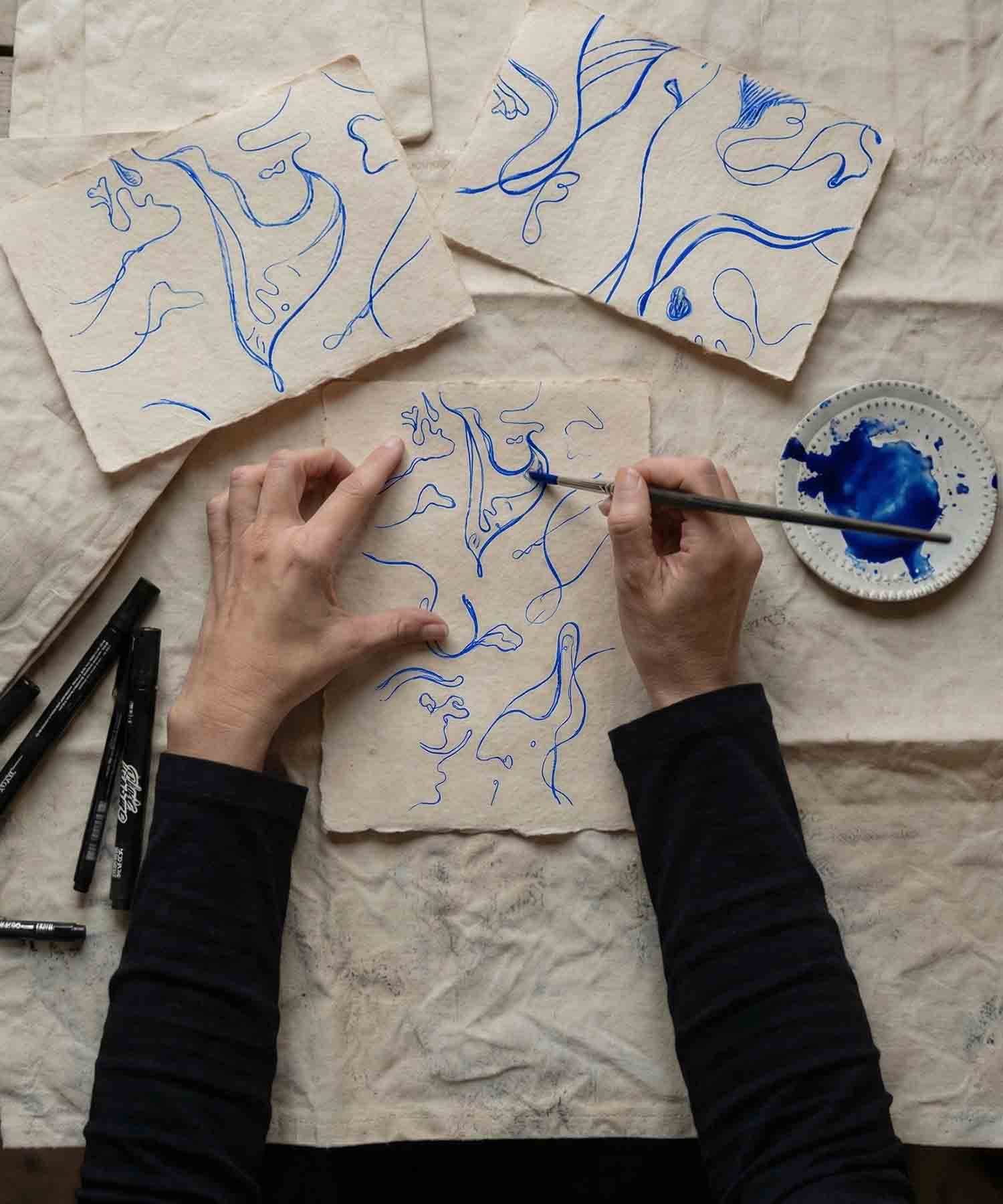 Všechny vzory, které na mých látkách vidíte, začínají na papíře. Ne v počítači, ale tužkou a štětcem. Mám ráda ten moment, kdy ruka udělá nedokonalou čáru – právě ta dává vzoru život. Tuto ‚lidskou stopu‘ pak přenáším na textil.